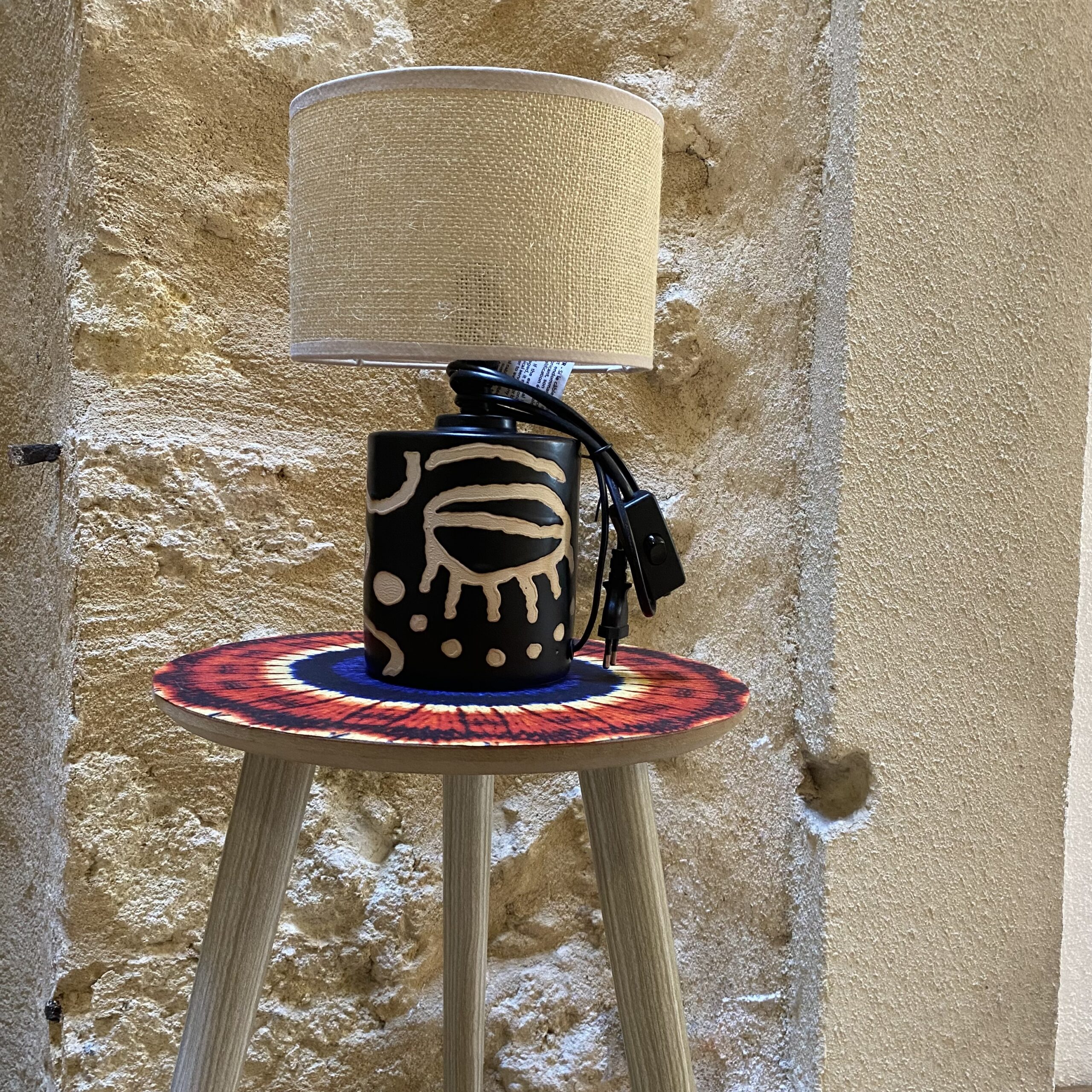 Réalisée en toile de jute au niveau de l’abat-jour, le socle est en céramique rehaussé de gravure ethnique.