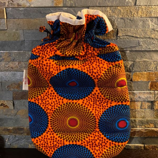Superbe sac de protection en tissu wax molletonné pour votre bouillotte. Un accessoire indispensable de l’hiver et qui vous permet de bénéficier en toute sécurité de la douce chaleur de votre bouillotte.