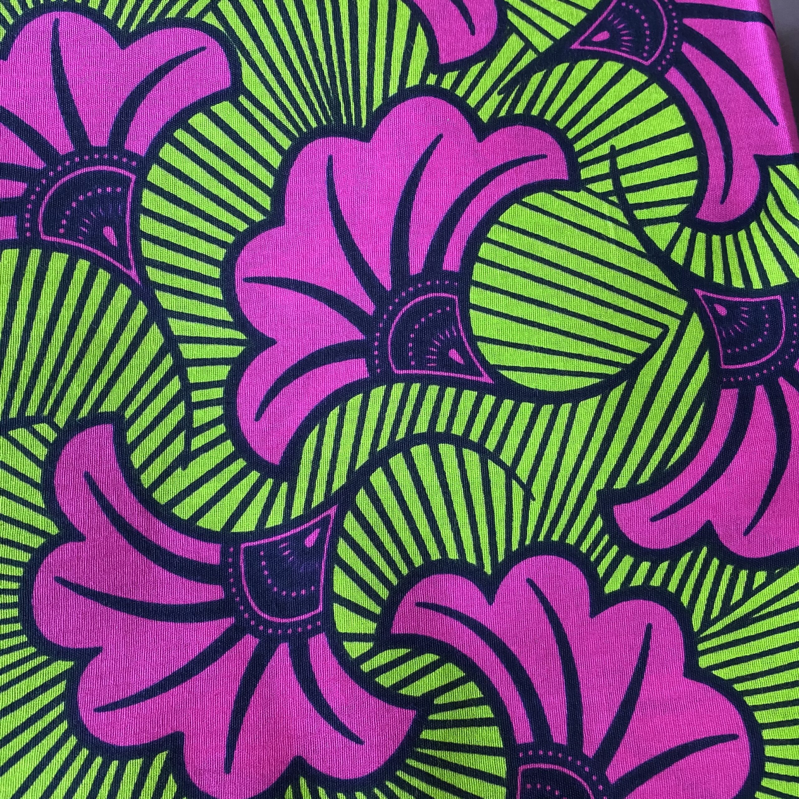 Du peps et de la couleur pour ce magnifique tissu wax « Fleurs de mariage » vert et mauve.